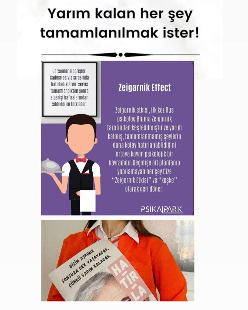 Birlikte çalıştığımız yayınevinin çıkarmış oldukları derginin kapağındaki“Bizim aşkımız sonsuza dek yaşayacak. Çünkü yarım kalacak” cümlesinin altında yatan gerçek Zeigarnik Etkisi.Bu terimle ilk kez kardeşimi kaybettikten iki üç yıl sonra karşılaştım. Onu kaybedeli neredeyse üç yıl dolmuştu. Ancak ben hala kendimi toparlayamamıştım. Bu konudan insan...